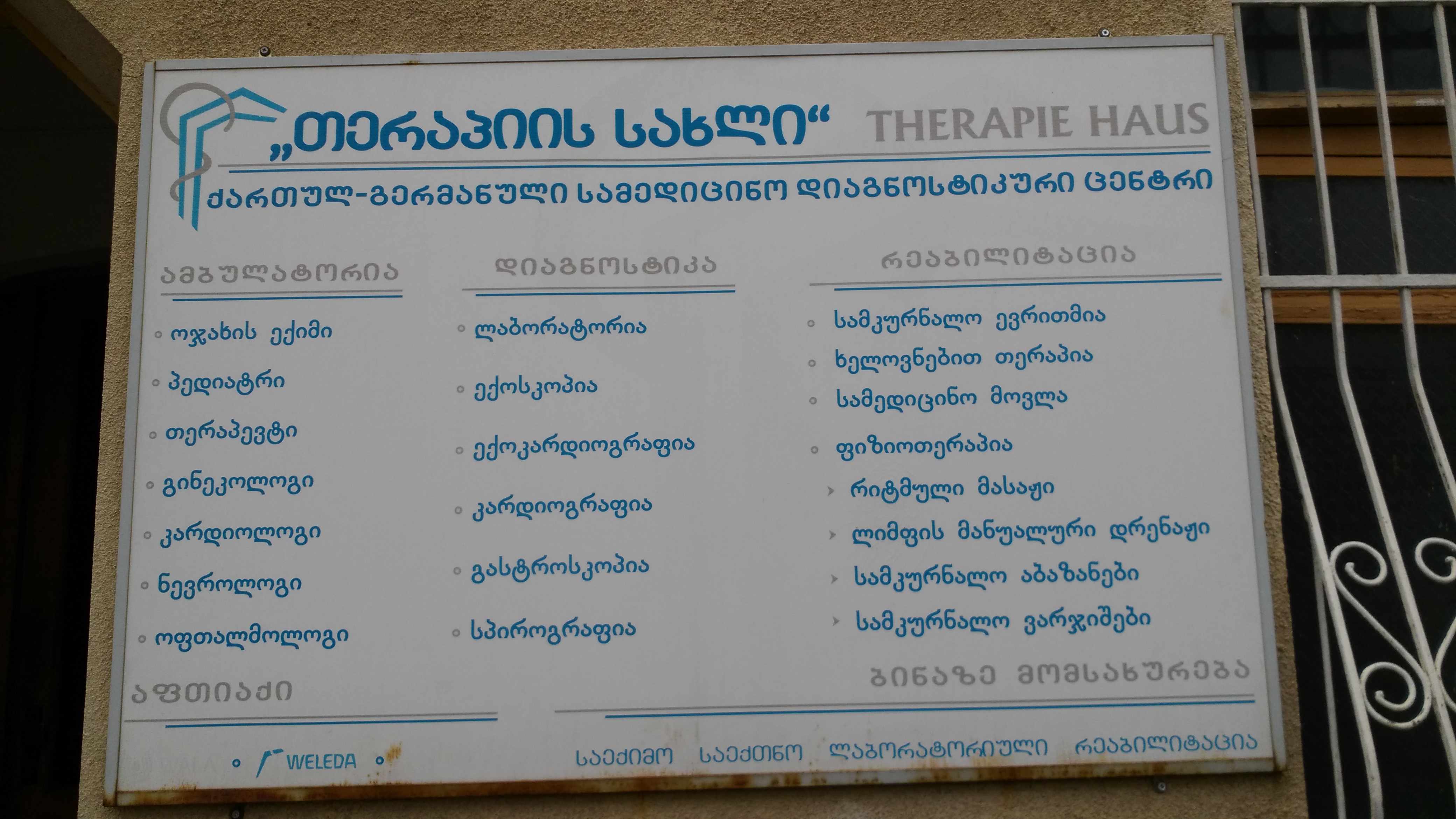 Wer hätte das gedacht? In einem Aussenquartier von Tiflis, San-Zona, gibt es ein anthroposophisches Therapiehaus. Dies geht auf den Giftgasangriff der Russen im 1990 zurück, als die GeorgierInnen für ihre Unabhängigkeit auf die Strasse gingen. Die Giftgasopfer wurden damals von deutschen anthroposophischen ÄrztInnen behandelt. Aus diesem Einsatz heraus wurde dann das Therapiezentrum gegründet. Es deckt sehr viele Bereiche ab: Allgemeinmedizin, Gynäkologie, Labor, Ultraschall, Kunsttherapie, Rhythmische Massage etc. und einen hauseigenen Kräutergarten. Aus diesem habe ich einen sehr guten Ringelblumentee bekommen. Etwas seeehr wertvolles: es gibt dort zwei georgische Ärztinnen, die Deutsch können.