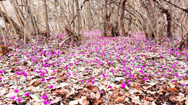 Zum Hirnauslüften gehen wir mit Sato, unserem jungen Hund, im Wald spazieren. Der Schnee, der wochenlang im Wald lag, hat einem Teppich von Vorfrühlings-Alpenveilchen Platz gemacht, diese sind hier endemisch