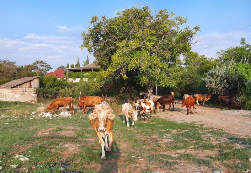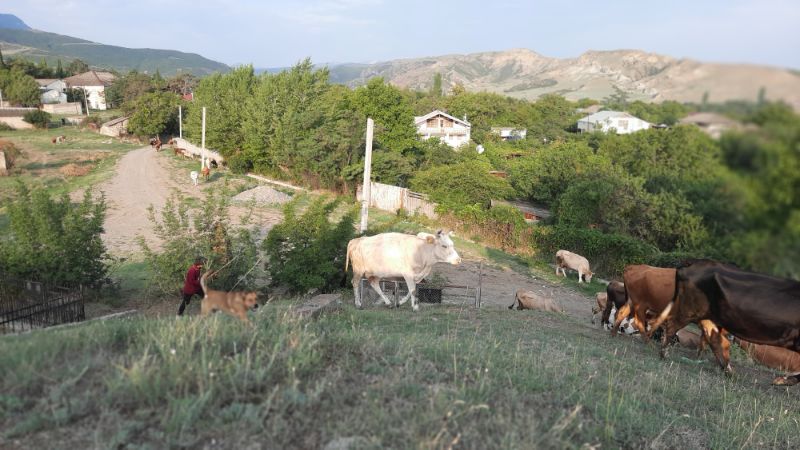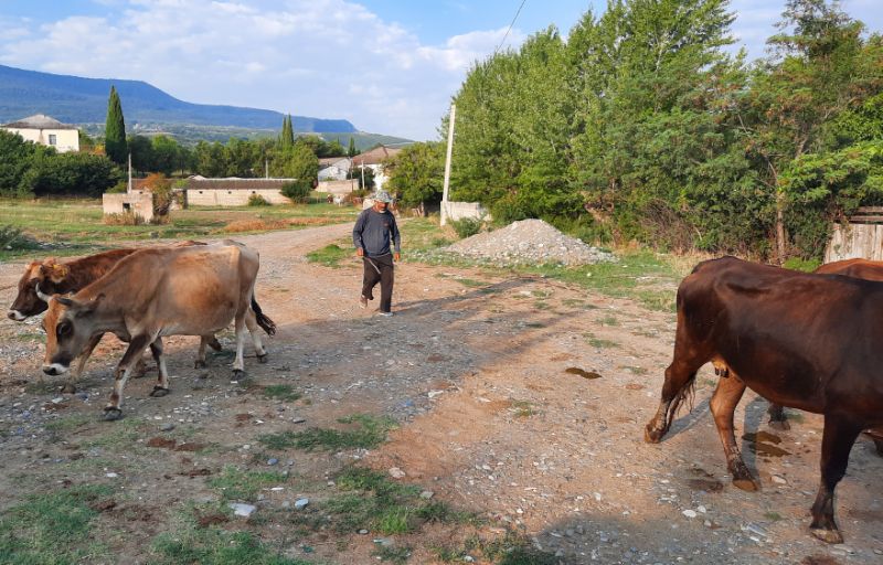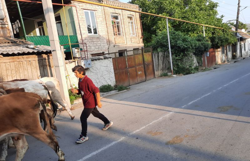 Rund hundert Kühe treiben Nini und ihr Bruder täglich von den zwei Dörfern Achalkalaki und Garikula ins süsse, würzige Grün. Von viertel nach sieben bis halb acht sammeln sie auf der Hauptstrasse der zwei zusammengewachsenen Dörfer die Tiere ein, dann gehts ostwärts raus aus den Häusern, aber halt, da kommen noch welche von oben, und Tamar sitzt geniessend im Kinosessel vor ihrem noch geschlossenen Gemischtwarenlädeli.