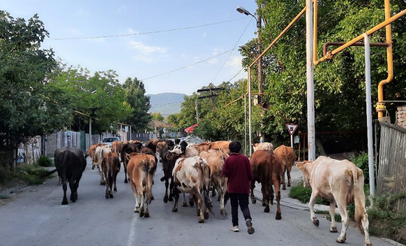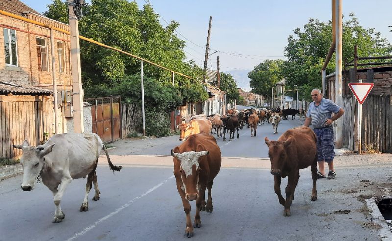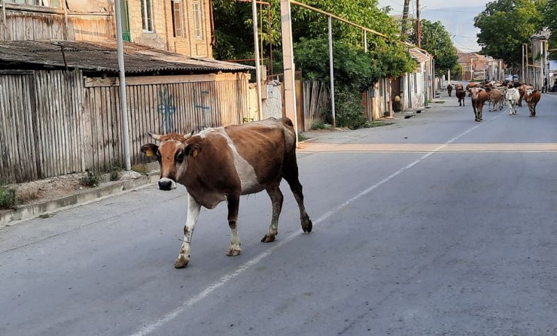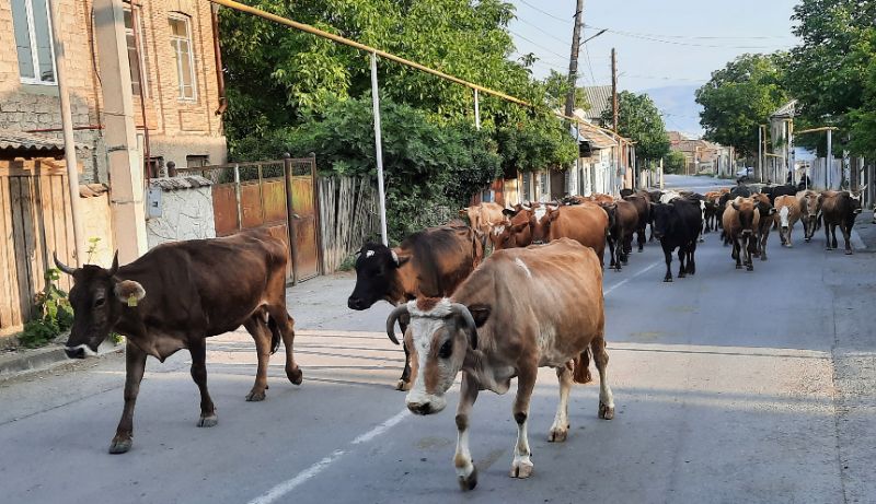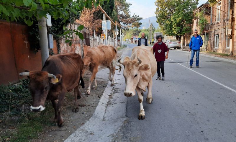 Samstagmorgen, 07:16, die Hauptstrasse von Achalkalaki in Zentralgeorgien ist leer, nur zwei ältere Herren halten am Strassenrand einen Morgenschwätz. Wartend vor der Apotheke mach ich ein bisschen Beingymnastik, das fiel mir plötzlich ein, früher machte ich das oft, und beim nächsten Mal schauen gehts los: Das muss die Leitkuh sein, mit sicherem Schritt führt sie den rumpelnden Tross an, von den Seitenstrassen stossen laufend mehr dazu