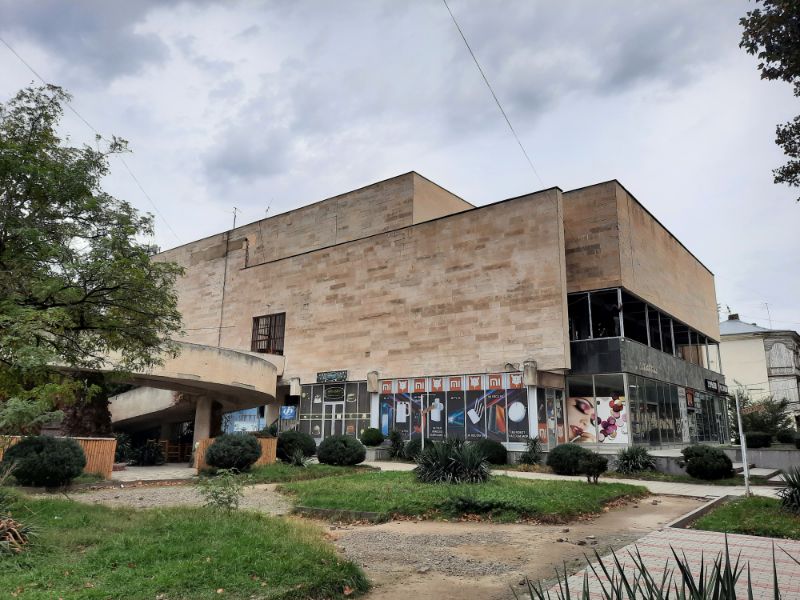 Im Alltag dominieren für mich in Gori jedoch die vielen sehr einfachen Marktstände den Strassen entlang, oft sind die Verkäuferinnen und Verkäufer russischsprechend. Viele Secondhand-Kleider, da werden Teppiche und Türvorleger direkt aus dem Kleinbus verkauft, und hier stosse ich auf schöne Maroni, die hab ich gesucht. Sie sind in drei Grössen sortiert: klein, mittel, gross. Ich nehme von den Mittleren „Saidan arian/Von wo sind sie?“ „Zugdidi“. Die Maroni sind aus Zugdidi, das ist die Hauptstadt der Küstenregion Mingrelien. Fünfzig Meter weiter stehe ich vor dem in bester Sowjetarchitektur gehaltenen ehemaligen Kino Sakhli, dem Kinohaus. Es steht leer, in der einen Hälfte des Erdgeschosses hat sich ein Elektrofachgeschäft eingenistet