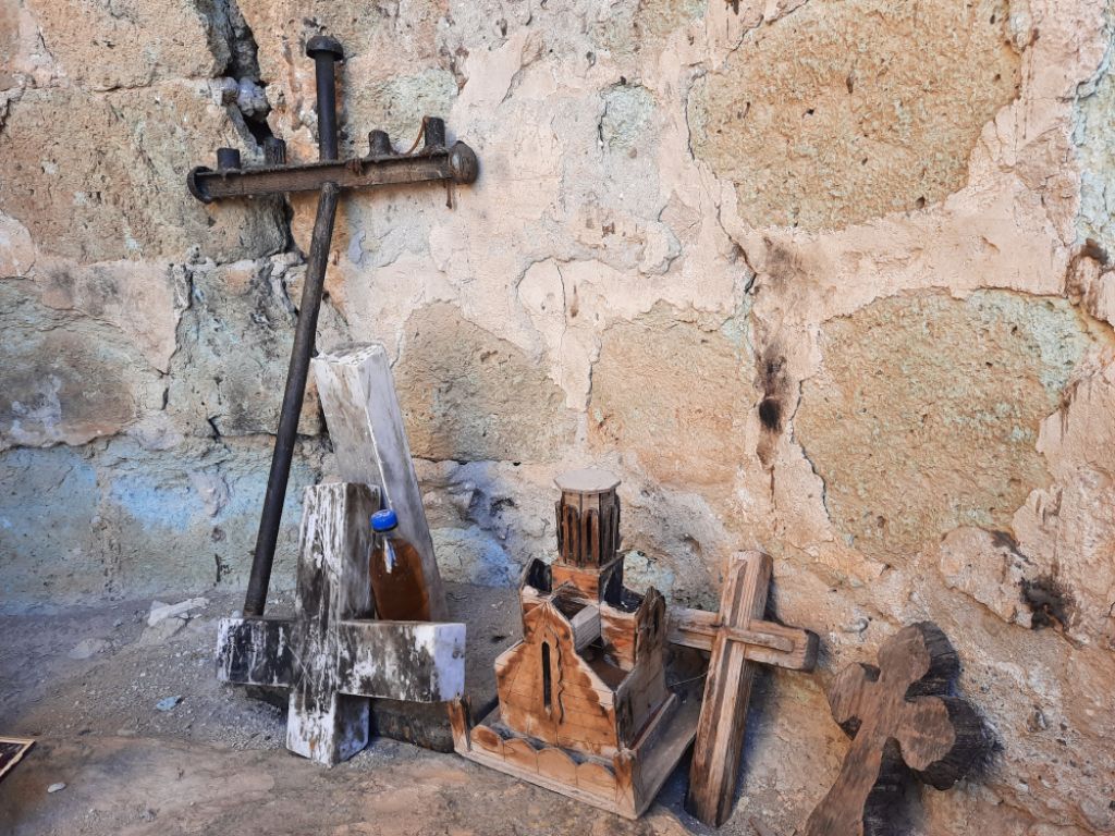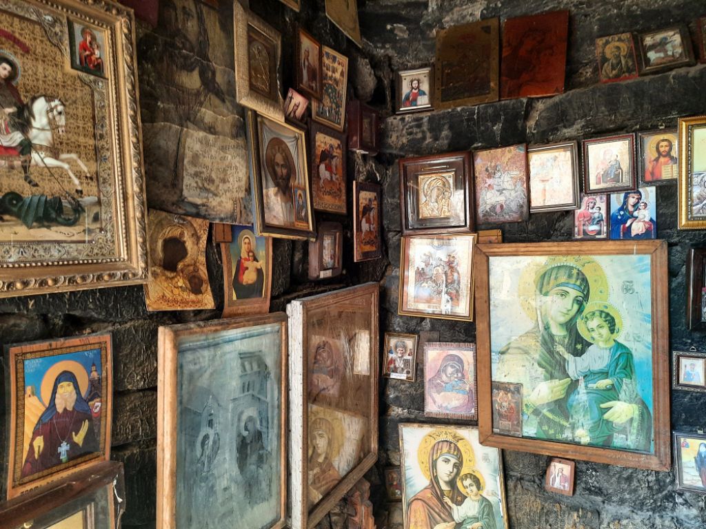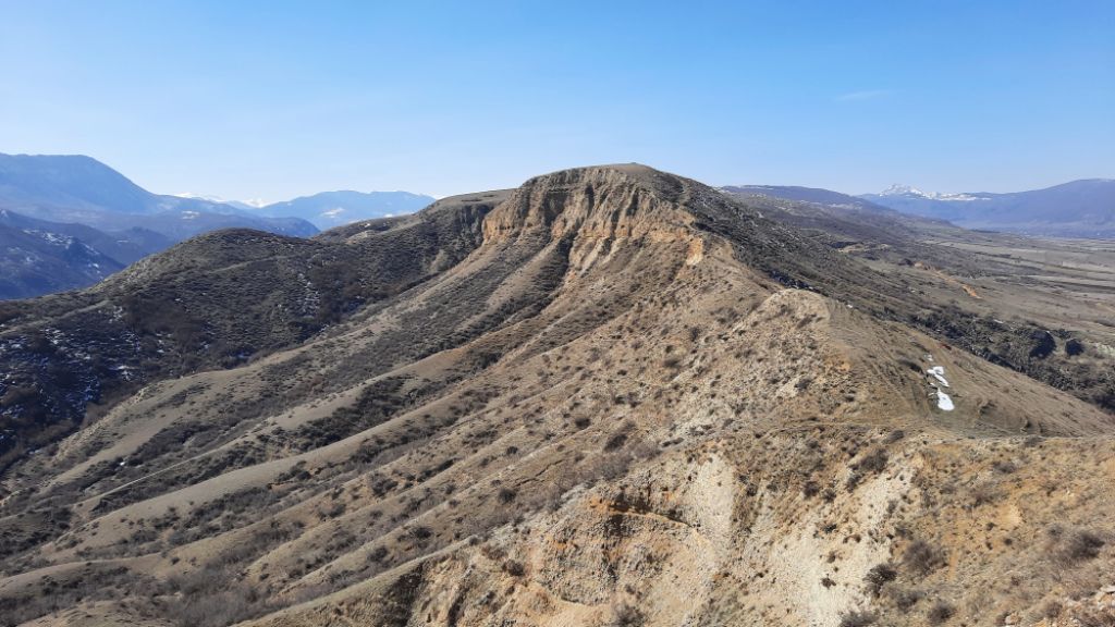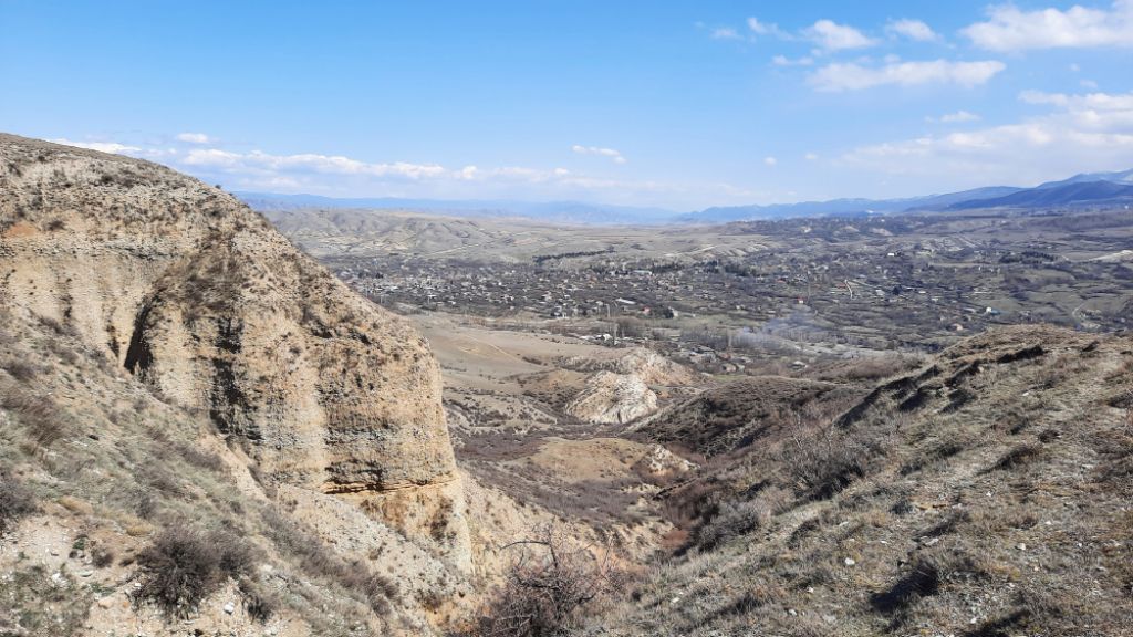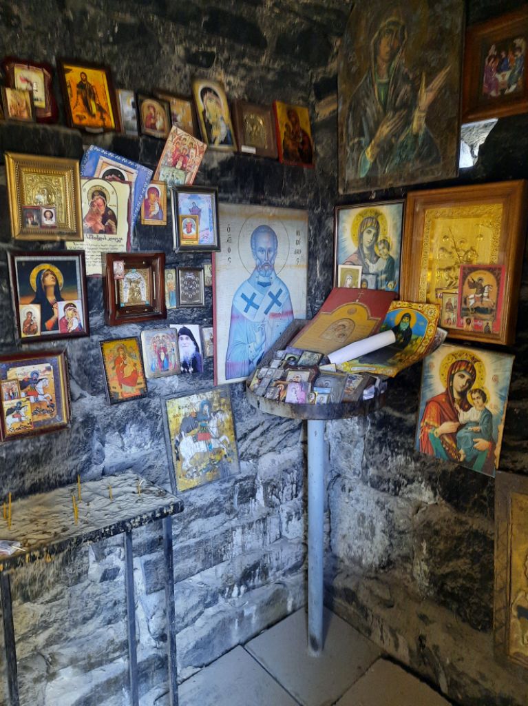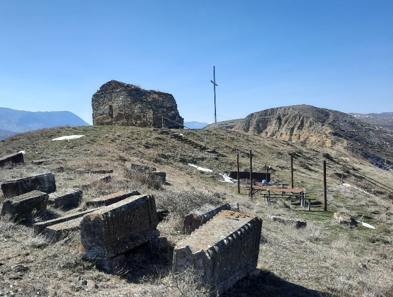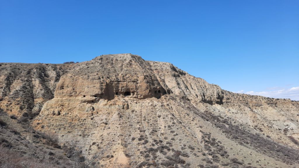 Über den Fluss, im nördlichen Hügelzug, der unser Dorf vor dem Westwind schützt, der oft über die nachgelagerte schmale Hochebene fegt, hat es Höhlen. Bei osmanischen oder persischen Angriffen zog sich die Bevölkerung vor 500 Jahren in die Höhlen und den Fels zurück und bereitete von dort die Verteidigungsangriffe vor. Hoch auf der Krete gibts noch heute eine Kapelle, und rundherum auf dem Boden, wie verstreut, uralte Grabsteine.
